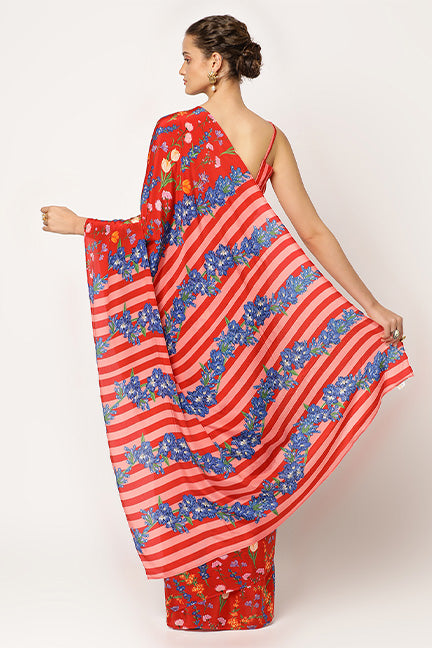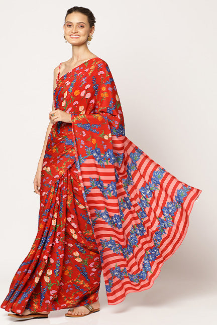 The richness of our 'Crimson Bouquet' saree, a stunning creation in natural crepe. Immerse yourself in the rich glow of red, a color that speaks of auspicious beginnings and unwavering confidence. Crafted from natural crepe, this saree drapes like a dream, its lightweight fluidity whispering tales of intricate floral patterns, elegance and sophistication.
